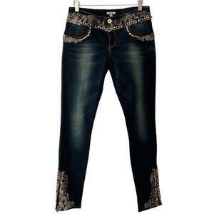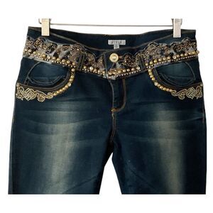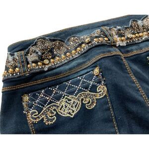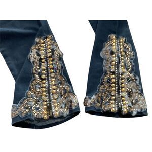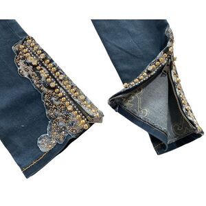 Gorgeous, never worn embellished jeans! Sequins, embroidery, and faux pearls are arranged at the waist, rear pockets and beautiful gems at hem too, with zippers so you can accommodate boots. Size 6, but are larger and have a good bit of stretch. I’m guessing more like 8-10. 16” X 29.5”