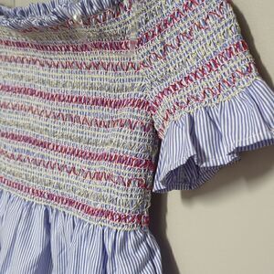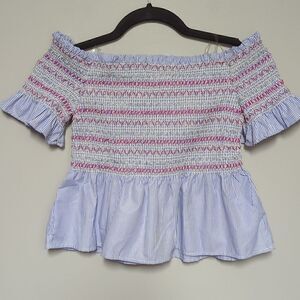 Blue and White striped smocked off the shoulder blouse. Stretchy bodice