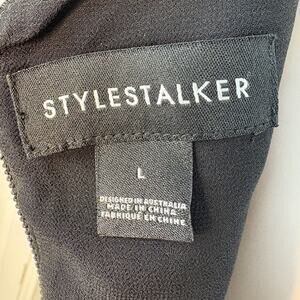 This is a StyleStalker black sheath dress in size L, featuring a sleeveless design with a V-neckline and a cut-out detail. It has a mini dress length with an exposed zipper closure.