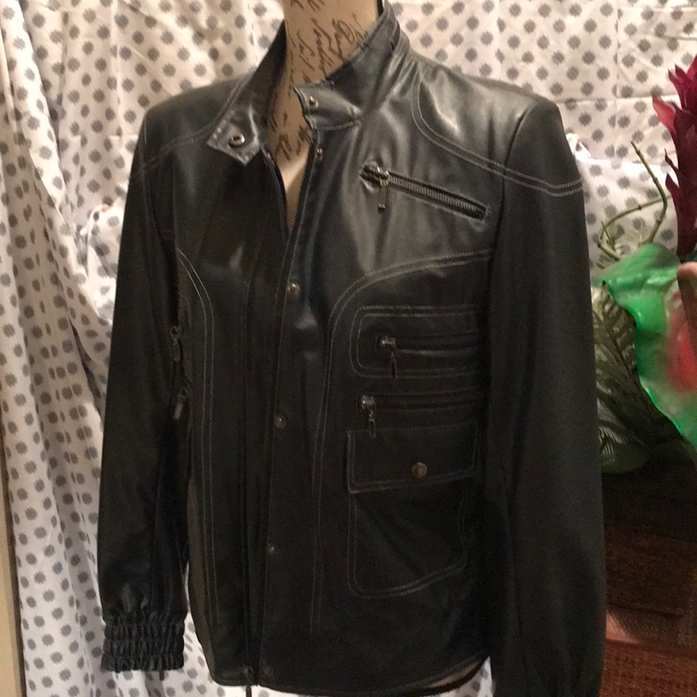 Styled dark blue Jacket. 83% polyvinyl 17% Polyurethane backing 100% Polyester Lining 100% polyester. Care: Hand wash cold