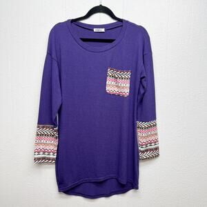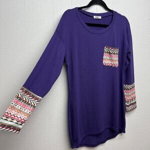 Styleword women's tunic sweater dress. Scoop neck. Long sleeves. Chest pocket. Contrasting multicolor print on pocket and cuffs. High-low hem. Stretch. In good used condition. No stains, tears or holes.