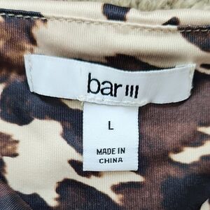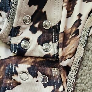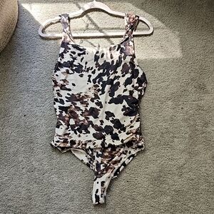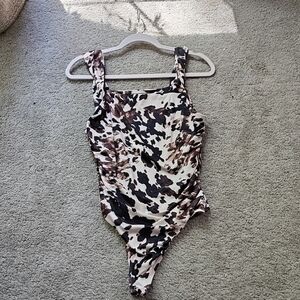 Trendy animal print bodysuit with a chic design. Features a mix of black, brown, and cream colors.