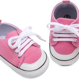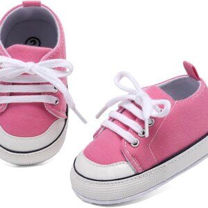 Features: Cute pink high top sneakers with a classic star design, easy lace-up closure, and an elastic ankle band that keeps them secure without fuss. The lightweight sole made of leather and rubber provides traction and flexibility for new walkers.