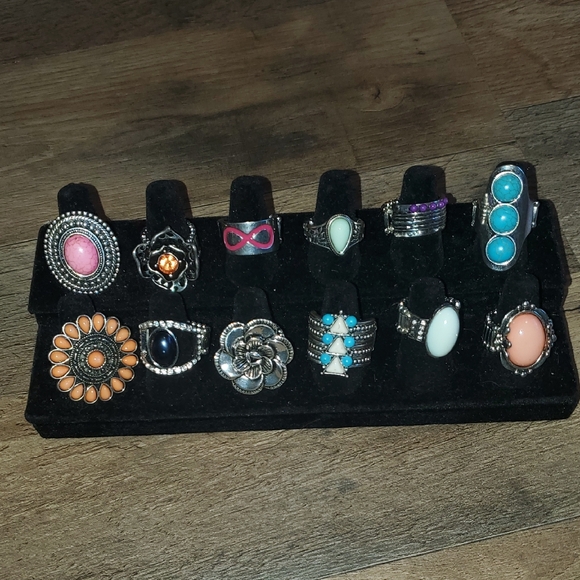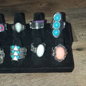 Set of assorted rings featuring various designs and colors. Includes pink, orange, turquoise, and silver tones. rings feature a stretch back fittings sizes 6-11 comfortably. sale includes all 12 rings. #lot4