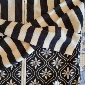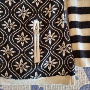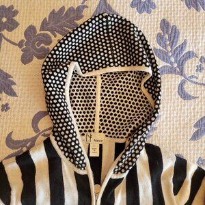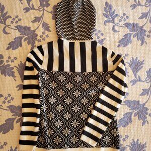 This is a beautifully made zip-up sweater jacket, 80% cotton, 20% wool. Very comfy! The design is eye-catching but still goes with most anything. Great quality and fit.