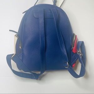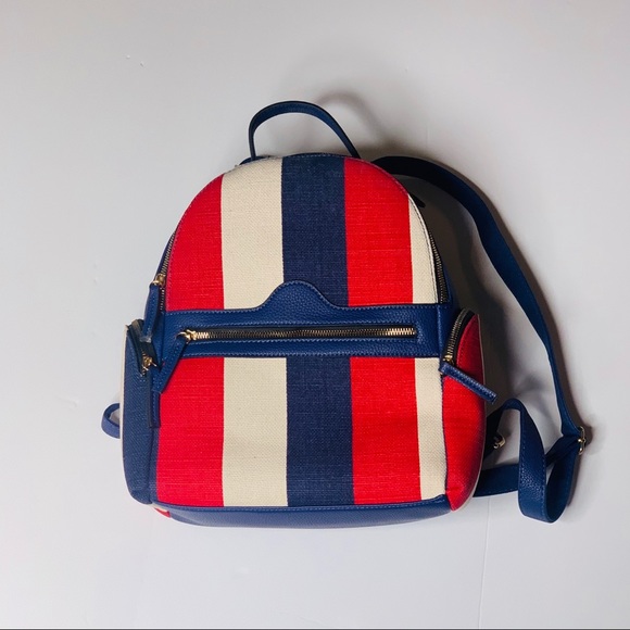New trendy backpack accessory. Can be used a purse or as a travel back. Features matching wallet! Color: Red, White and Blue. Front and side pockets with zipper.