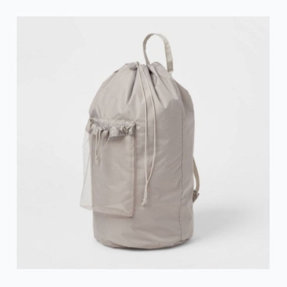 Chic beige drawstring backpack with mesh pocket. Perfect for everyday use. or backpack laundry bag