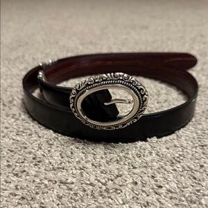 Enhance your wardrobe with this stylish black belt featuring an ornate silver buckle. Ideal for adding a touch of elegance to any ensemble.