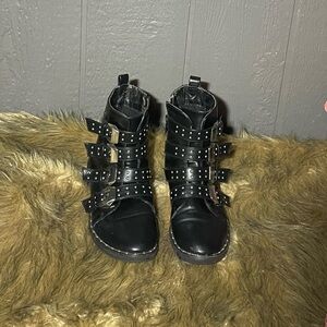 Black and silver studded ankle boots with buckles in good conditions does have some signs of wear on the inside as seen on the last pictures other than that no rips or no holes