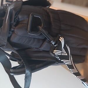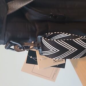 This black crossbody bag is designed for everyday use, featuring a durable fabric construction and a chic chevron-patterned strap. Its sleek, rounded shape offers a modern look, while the adjustable strap ensures a comfortable fit. Perfect for adding a touch of style to any casual outfit.