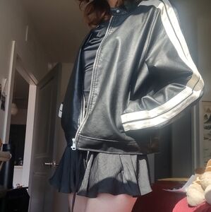Elevate your style with this sleek black leather jacket. Perfect for any occasion, this jacket offers both comfort and sophistication.