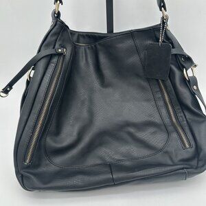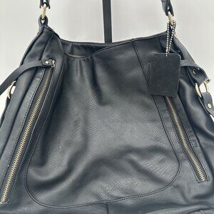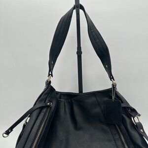 Stylish Black Leather Shoulder Bag With Geometric Lining & Multiple Zippers
