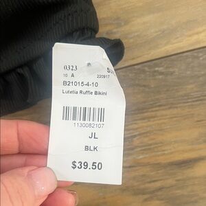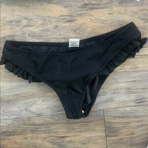 Elegant black bikini top with ruffle accents. Features adjustable straps.