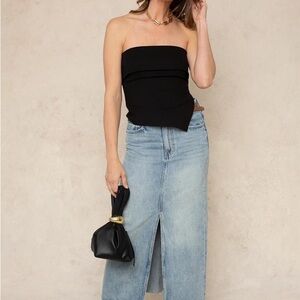 Elevate your style with this sleek black strapless crop top. Perfect for any occasion, it offers a modern and versatile look.