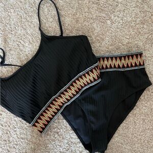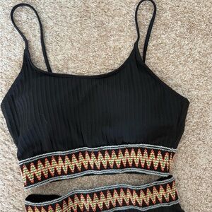 This chic black one piece swimsuit features vibrant patterns for a playful touch. Perfect for fun days at the pool or beach.