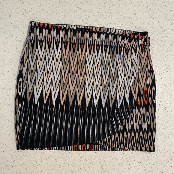 Bebe chic black and orange wrap patterned skirt. Button and snap close at waist. Perfect for any occasion, this skirt offers a unique design that stands out. Excellent Condition and closet kept in a smoke free home.