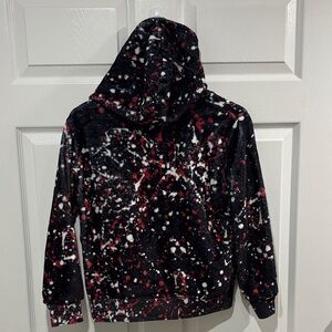 Elevate your child's wardrobe with this stylish hoodie featuring a bold black and red splatter design. Perfect for adding a touch of flair to everyday outfits.