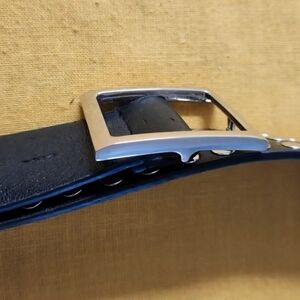 Elevate your outfit with this chic black leather & silver belt. length end to end is 42" with 5 holes. Smallest size would be 33". Approx 1.5" width
