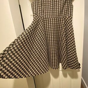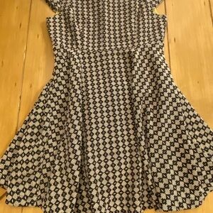 A-line midi dress that is new without tags NWOT. The dress features a knit black and tan geometric pattern, with short cap sleeves and a round neckline. Made from a mix of polyester and cotton, the dress is comfortable to wear and easy to care for. The dress also features a zip closure and is knee-length. It has such a pretty feminine lining. No stains or marks. In new condition. Thank you for considering my item 🌷