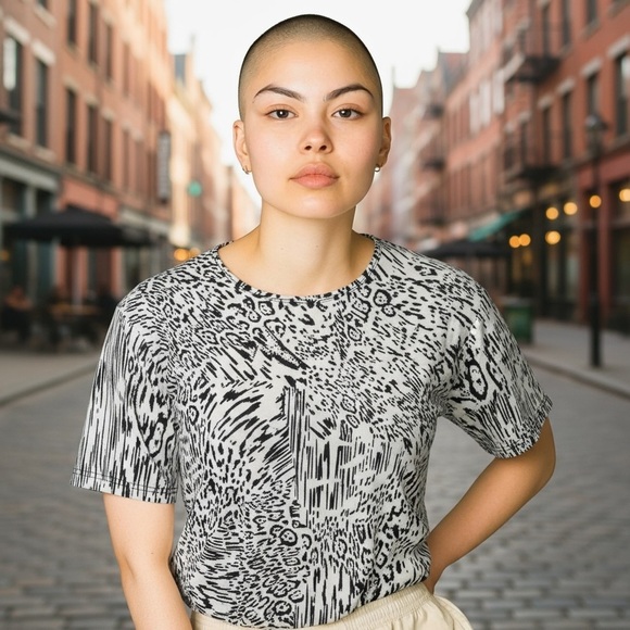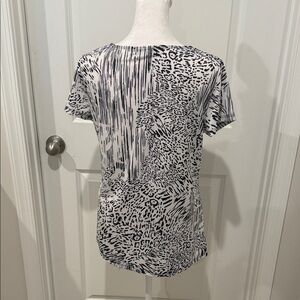 Discover elegance with this stylish black and white patterned short sleeve top. Perfect for any occasion.
