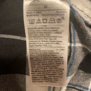 Trendy plaid shirt with a classic button-up design. Features a sleek black and white pattern with subtle blue accents. A lightweight dress that would be perfect with flats or boots!
