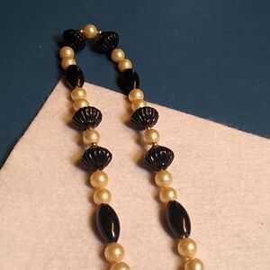 Chic necklace featuring black and cream beads. Perfect for any occasion.