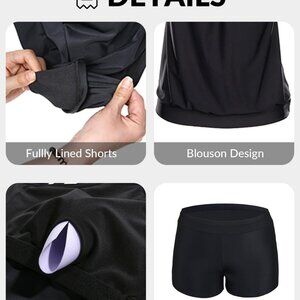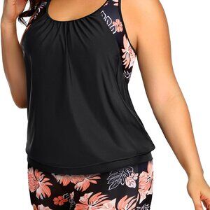 Features: Flattering tankini with a chic blouson overlay that stays put in the water, plus a double-layer design for extra tummy support and coverage. The high-waisted boyshorts are non-see-through and comfy, perfect for swimming or lounging poolside. The racerback style with a built-in, removable pad bra offers great bust support and freedom of movement.