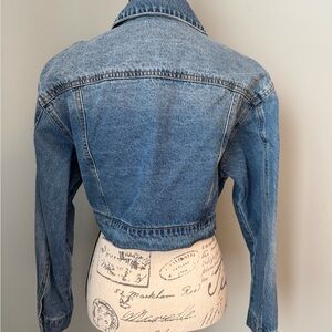 Trendy blue denim jacket with button closure. Perfect for casual wear.