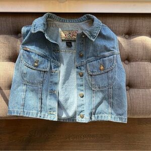 Vintage Express Jeans denim vest with a relaxed fit, great for layering over a white tee