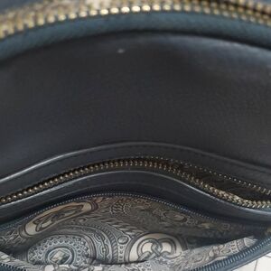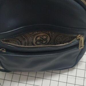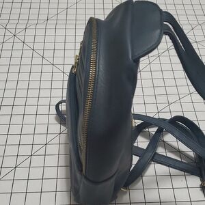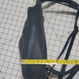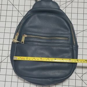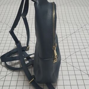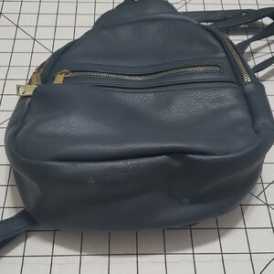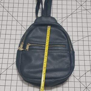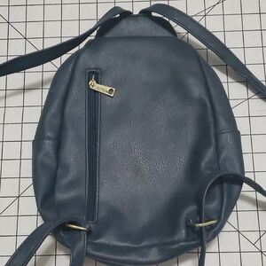 Chic mini backpack in a sleek blue color. Features a front zip pocket with gold-tone hardware.