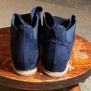 Stuart Weitzman Blue suede booties with hidden heel and gold detailing, very light weight. Leather sole, Made in Spain.