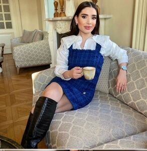 Chic blue tweed pinafore mini by Zara with pearl button details on two front pockets. size medium. sold out everywhere. bloggers favorite!! Perfect for layering.royal blue and black