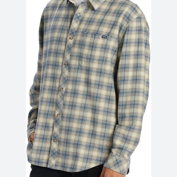 Trendy plaid shirt with button-up design. Features a stylish blend of blue and cream colors.
