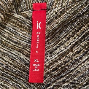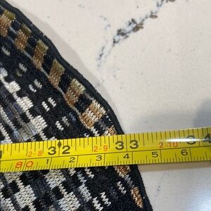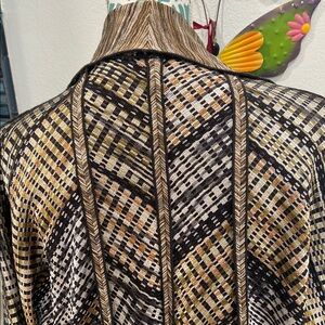 Elevate your wardrobe with this stylish brown patterned sweater. Perfect for any occasion, this piece combines comfort and fashion effortlessly. Gold, black and tan. Pairs well with pants or skirts. Tapered longer in the back.