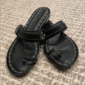 Trendy black sandals with toe ring design and silver accents. Perfect for casual wear. Bottom has peeling on rubber sole (See pics). These have never been worn.