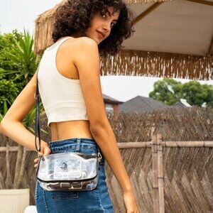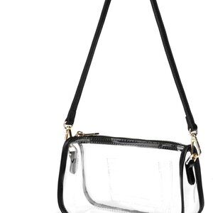 Features: A sleek, transparent bag that’s fully compliant with stadium clear bag policies. Includes two removable straps—one slim leather shoulder strap for effortless slinging and one adjustable crossbody strap for hands-free wear. Spacious enough to fit essentials like wallet, phone, keys, makeup, and cards. Durable PVC with sturdy vegan leather trim gives it a trendy 90s Y2K vibe, perfect for dressing up or down.