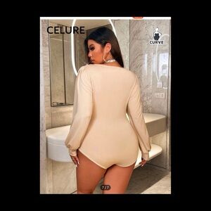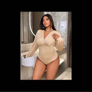 Elegant cream body suit with shimmering pearl accents. Features a flattering V-neck and long sleeves. Ideal for evening wear.