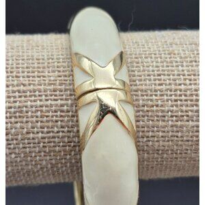 Stylish Cream Enamel & Gold Tone Hinged Bangle Bracelet Criss Cross Design MINT