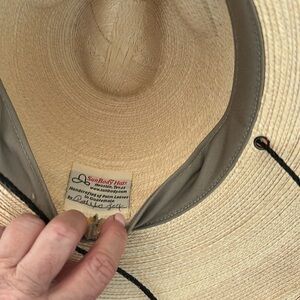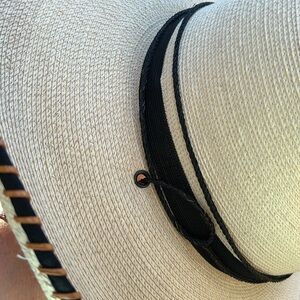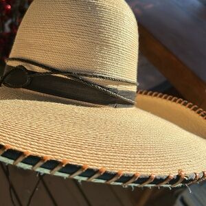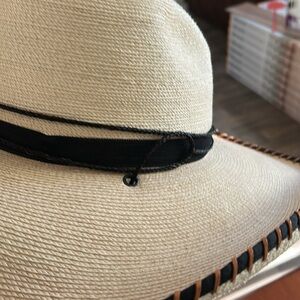 New Guatemalan handmade straw hat made from Palm leaves. The hat is cream color featuring a sleek black band and braided leather and horse hair pull string give a distinguish, first class look. 24” head size.