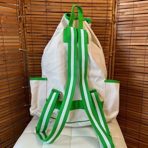 This chic cream backpack with vibrant green accents is perfect for everyday use. Its spacious design and stylish look make it a must-have accessory.