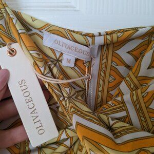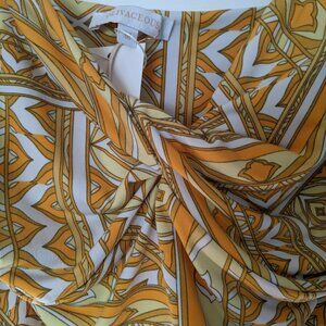 This crop is giving 70's! The pattern on the material is very Europe summer vacation. The twist tie front detail creates a lovely neckline. This top has never been worn and tags are still attached.