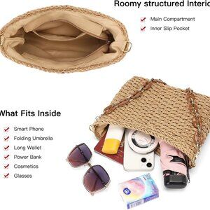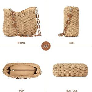 Features: This lightweight and soft straw bag combines style and practicality perfectly. Its spacious 9 3/8 inch size easily fits your beach essentials, snacks, or everyday items, with a handy inner pocket for cards and cash. The chic woven straw design adds a delicate, summery touch to any outfit, making it ideal for work, outings, travel, or market trips. Equipped with a secure zipper closure, it keeps your valuables safe while offering effortless style.