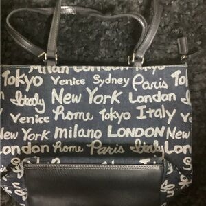 Explore the world with this chic blue and white tote bag. Featuring city names in a trendy design, it's perfect for everyday use. Durable and stylish, this bag is a must-have for any fashion-forward individual. Very gently used.