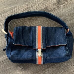 Elevate your style with this chic denim mini bag featuring vibrant orange accents. Perfect for any occasion, this bag combines fashion and functionality. Sizing: see photos. JLo brand Love blue jean bags!
