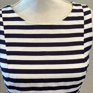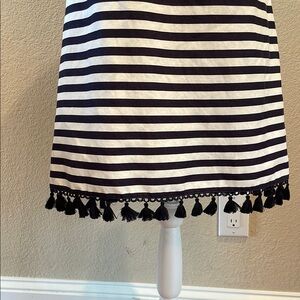 This Chic sleeveless SILK blend dress with classic navy and white stripes. The tasseled hem adds a fun and adoring element to this piece.