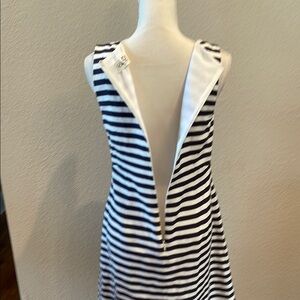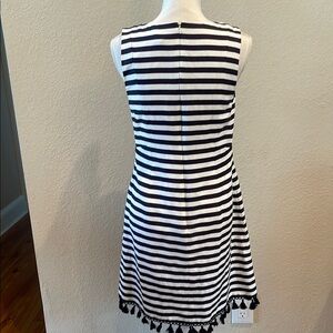 Stylish ELIZA J Navy and White Striped Silk Blend Dress with tassel hem
