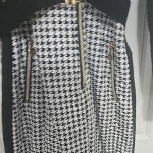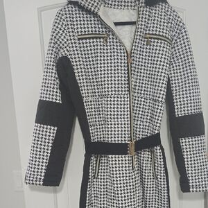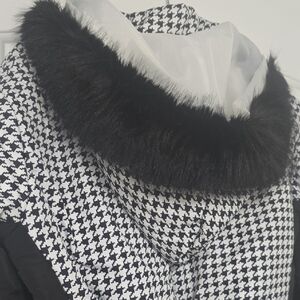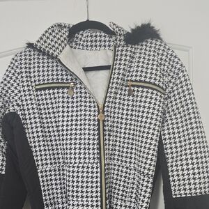 Elevate your style with this chic black and white houndstooth snowsuit. It combines comfort with a modern look. You'll be the most stylish person on the slopes! Super flattering. Black belt to cinch the waist. Beautiful black fur around the hood as an added detail. Zippers on the pants and arms so you can widen the sleeves or legs if needed. Zipper pockets to keep your items safe. NWOT. Never worn. Size XL. (I would say it fits like a size 12)