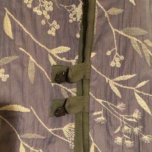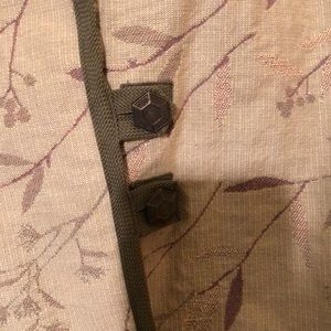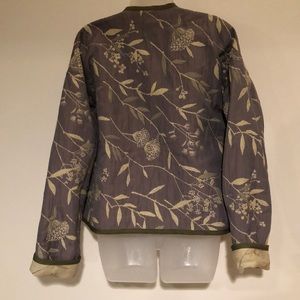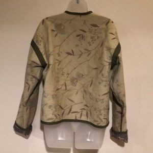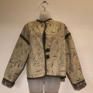 Boho Jacket, thick fabric, reversible, calming colors (livery light olive and very soft purple) and pattern. Fabric feels natural. Great with everything you can only imagine. No labels. Check for measurements -length 23”, sleeve 23”, armpit to armpit 23”. Bought at Boutique store