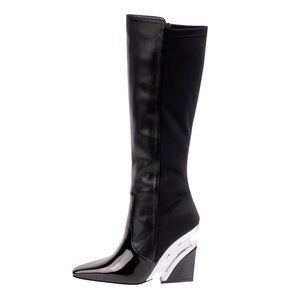 The boot is made of leather, and it is knee high tall with zipper on the side. It also has lucite heels.