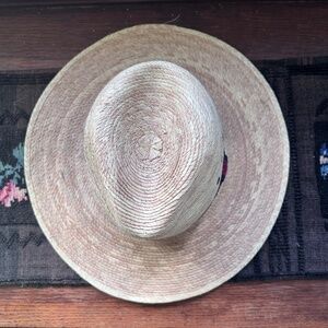 Stylish Fedora straw hat with dark red & blue band in excellent condition, like new. 8” diameter at widest point of opening.
